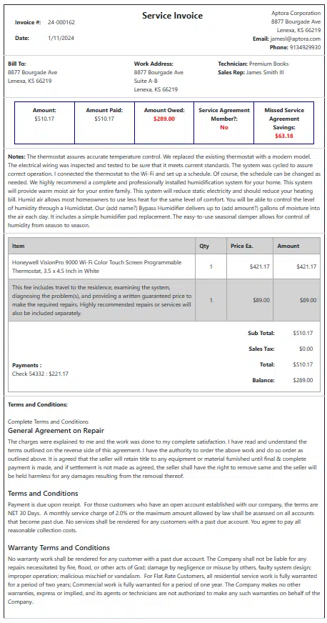 - Professional and Customizable Invoices: The software generates professional-looking invoices that are easy to understand and can be customized with company logos and other personalized details. These invoices not only impress clients but also facilitate easier sales of service agreements by showing potential savings. Your invoices may include flat rate pricing, time and materials, or both.